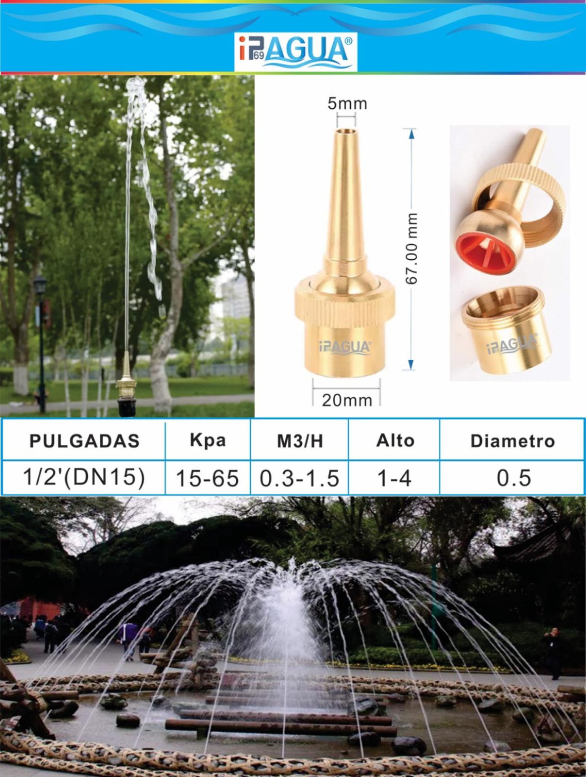 Cuenta con una conexión estándar de 1/2 pulgada, lo que permite su fácil instalación en sistemas hidráulicos comunes. Su diseño está pensado para producir un chorro de agua definido y uniforme, ideal para aplicaciones decorativas y ornamentales.